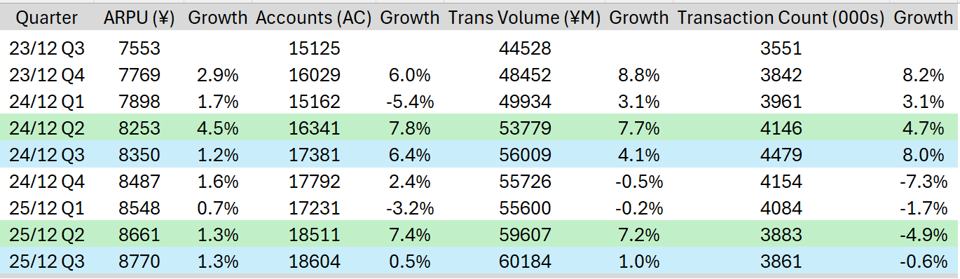 The average revenue per user looks solid. The number of accounts has grown, but less than a year ago, which explains the smaller growth in total transacted volume.