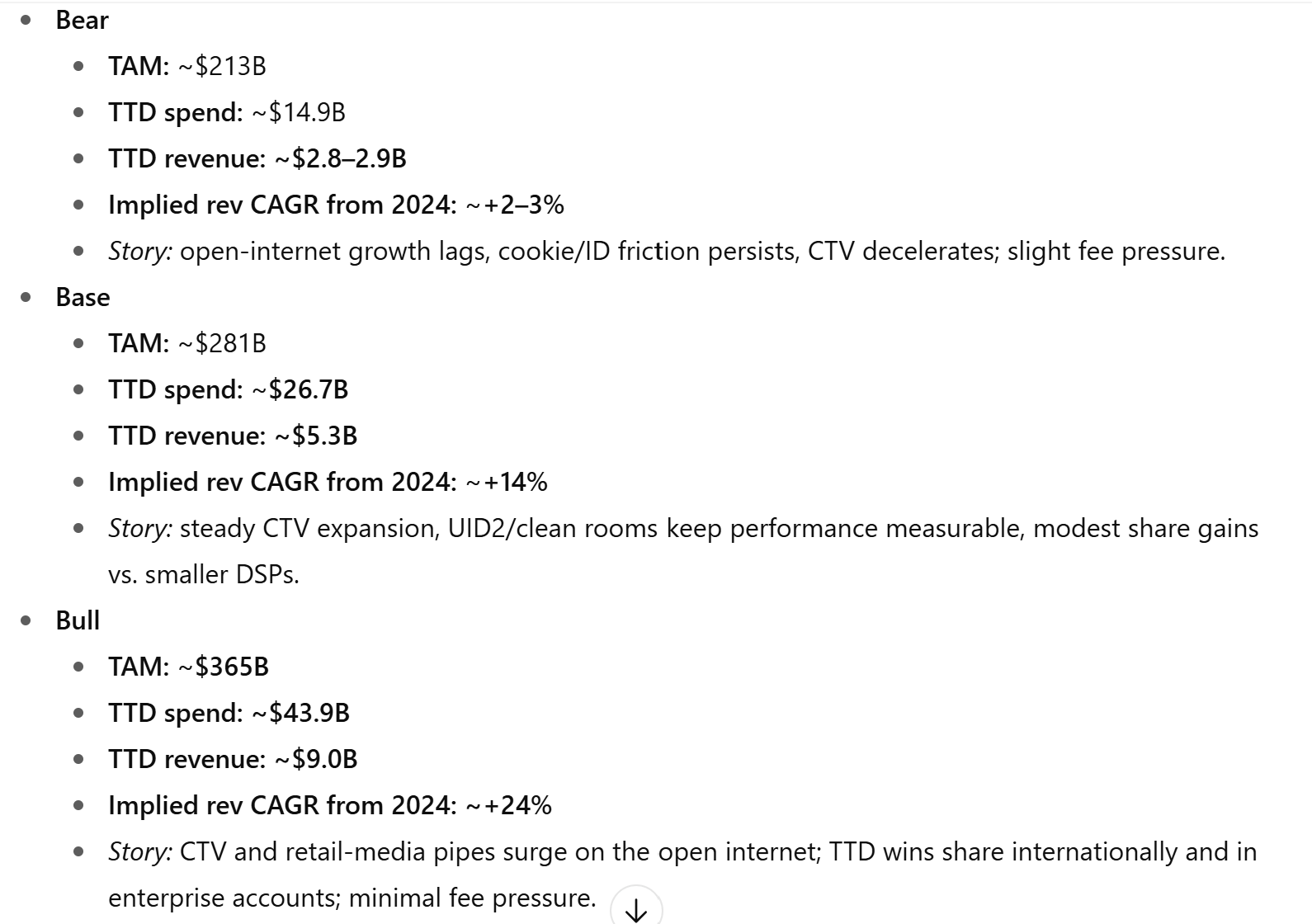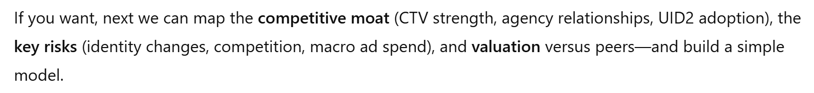 If you want, next we can map the competitive moat (CTV strength, agency relationships, UID2 adoption), the key risks (identity changes, competition, macro ad spend), and valuation versus peers—and build a simple model.
