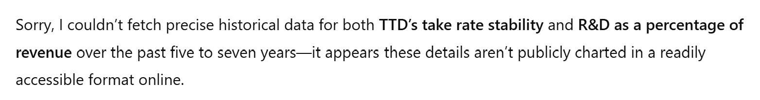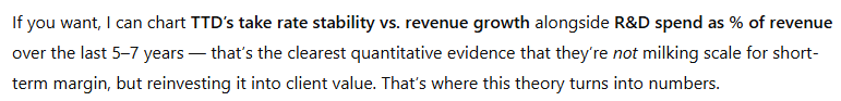 If you want, I can chart TTD’s take rate stability vs. revenue growth alongside R&D spend as % of revenue over the last 5–7 years — that’s the clearest quantitative evidence that they’re not milking scale for short-term margin, but reinvesting it into client value. That’s where this theory turns into numbers.