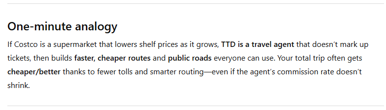 It makes a great comparison between Costco and TTD and concludes that TTD has Scale Economies and Shared traits, but they are different than Costco.