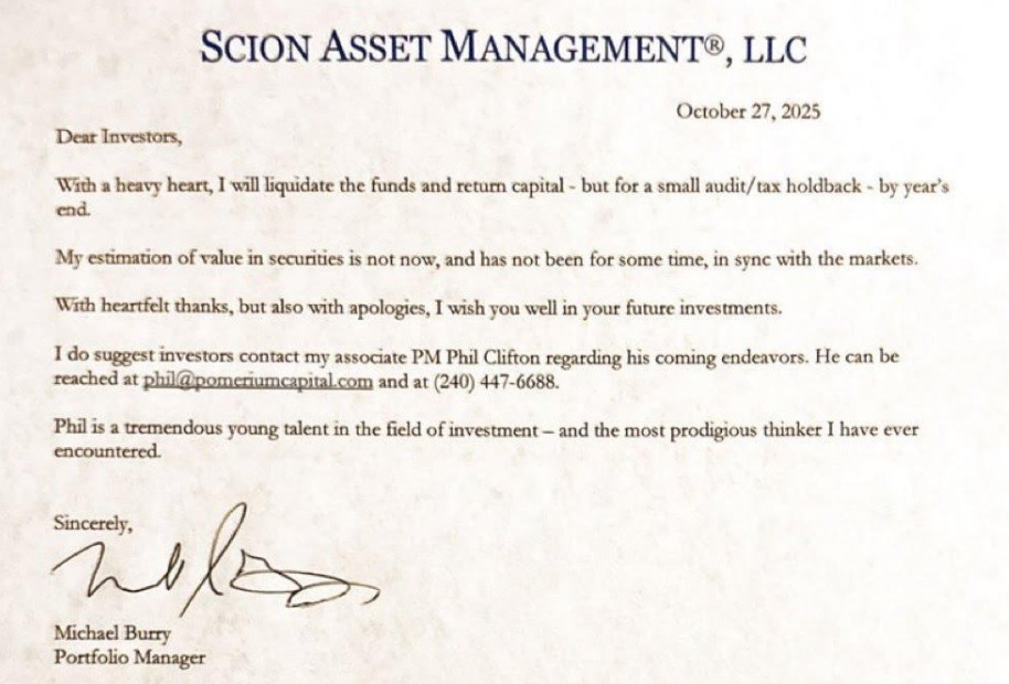 And Michael Burry, the famous big short investor who made a killing on the housing bubble in 2008, announced the shutdown of his hedge fund AND will be launching a blog on the 25th of November.