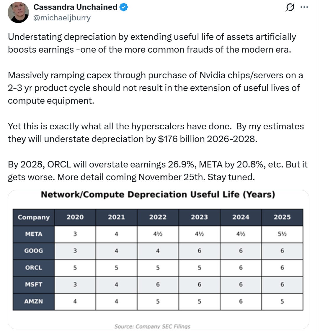 He also warned about market exuberance (although it seems he does this regularly), stating specifically that hyperscalers are understating their depreciations related to all the capex spending (meaning they are artificially pumping up their earnings).