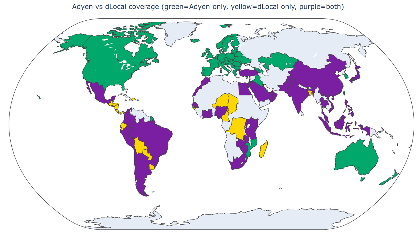 Why it’s interesting: dLocal looks like an Adyen (although there are differences, Adyen is more vertically integrated and does the extra mile to get licences to be the merchant acquirer), facilitating payments in emerging markets, but is more ingrained in emerging markets. Here’s something I cooked up using AI by parsing data from both companies: