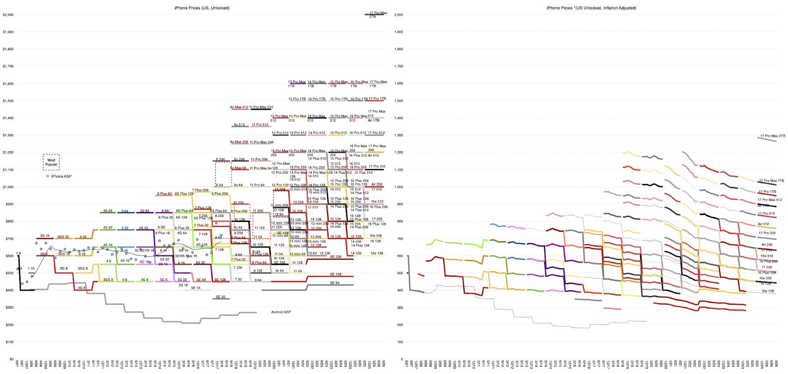 Upon its first introduction, it was priced at a whopping $499 (about $799 today). And below you can find what is called the Stairway to Heaven. On the left, you have the historical prices for all the models, and on the right, the inflation-adjusted pricing.x