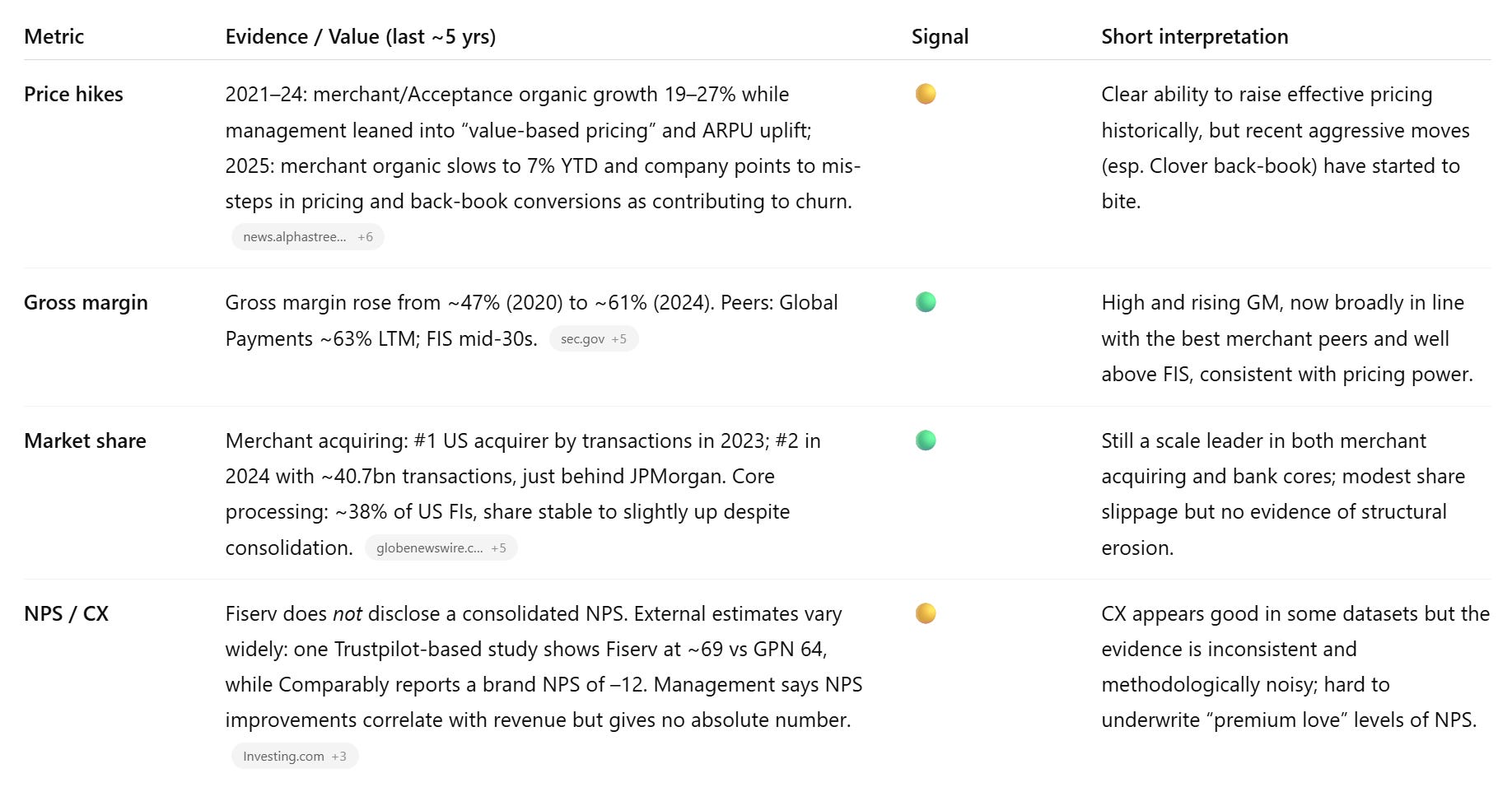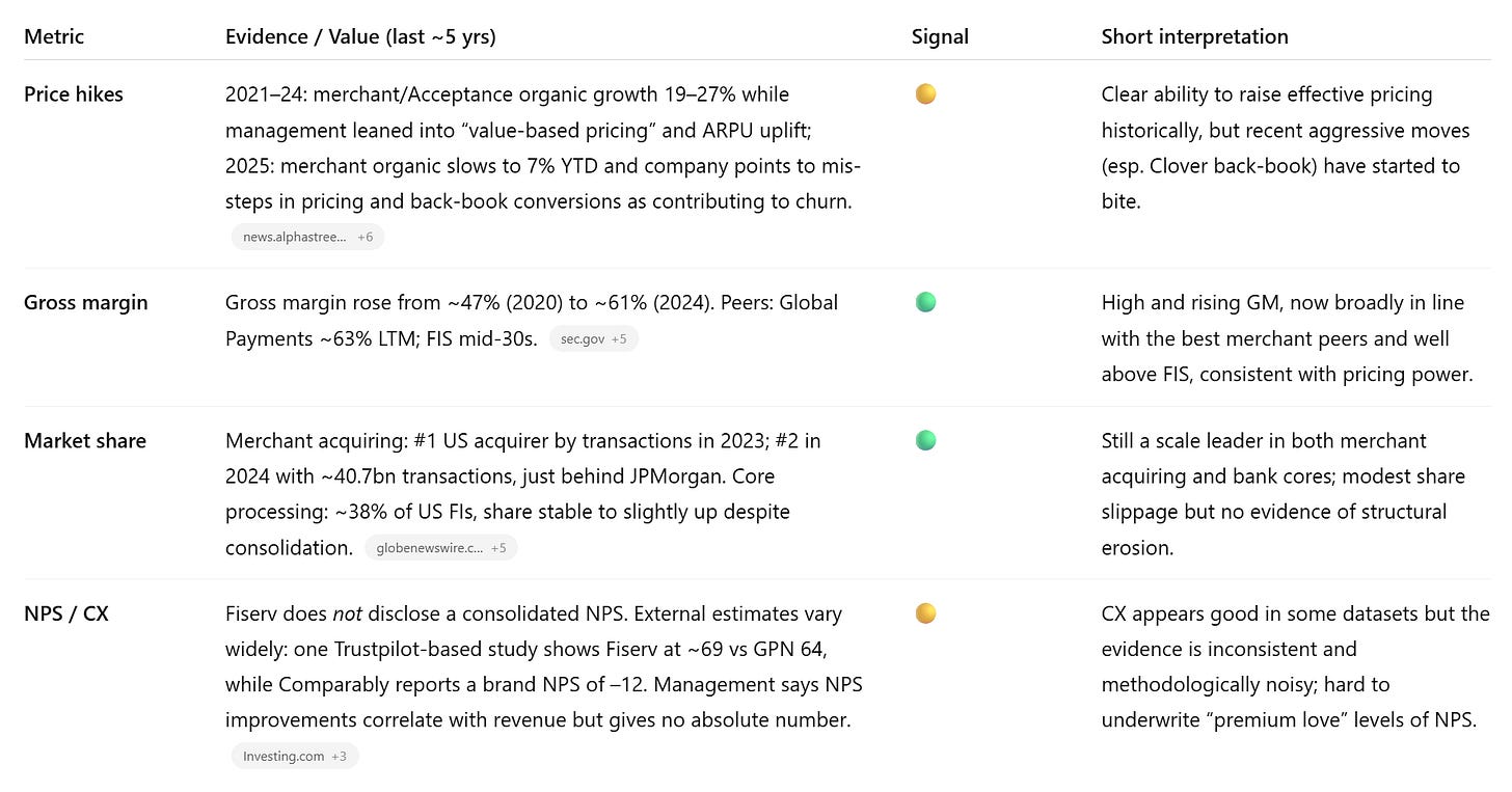 Overall: Compared to Global Payments, Fiserv shows similar or better gross margins, a stronger bank-tech franchise, and comparable merchant scale, all pointing to solid underlying pricing power. The 2025 reset, Clover-related churn, and lawsuits, however, demonstrate that management can over-reach on price/mix. I’d characterise Fiserv’s pricing power today as good but currently stressed, not broken.