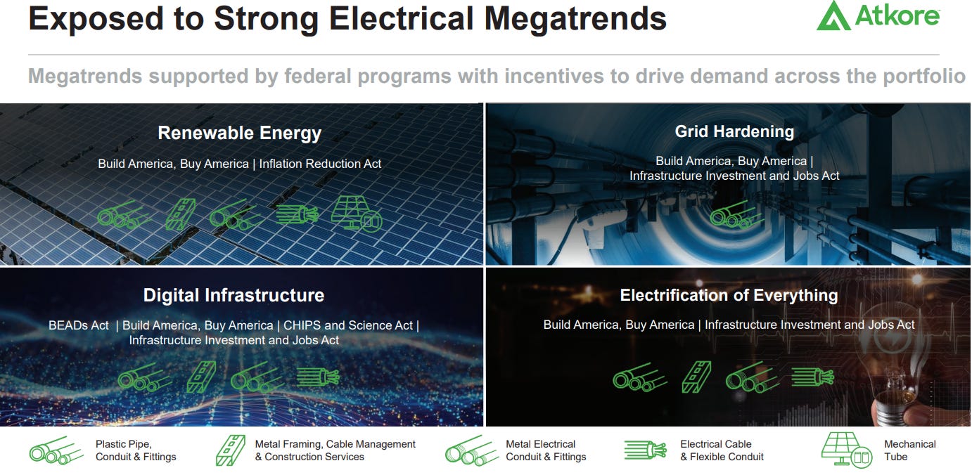 Atkore manufactures and distributes electrical products like conduits, and cable management systems to other professionals. They have a large distribution network with their transportation fleet. It has a worldwide presence.